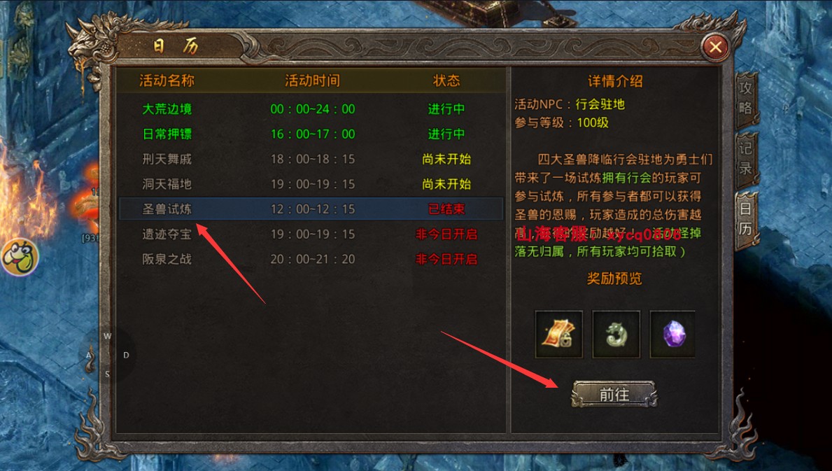 圣兽试炼入口会在开启前5分钟在boss挑战下方出现入口,也可以在boss攻略中的日历前往