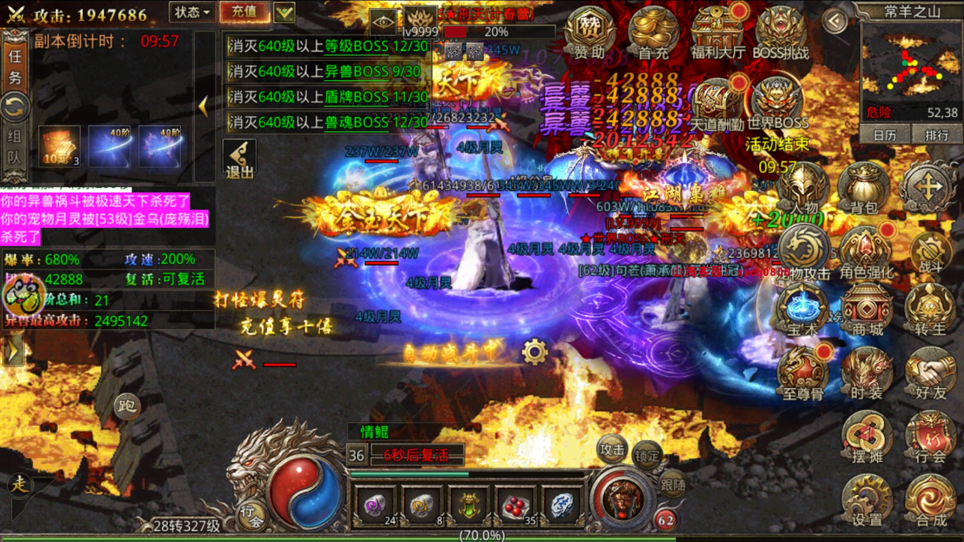 玩法介绍:活动开启时会刷新一只特殊的世界boss,boss无归属所有玩家都可以抢奖励,活动可以获得大量真充红包和高阶的盾牌和装备魂兽全靠抢。